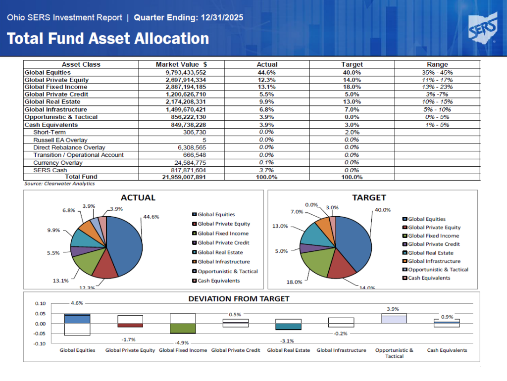For fiscal year ending June 30, 2025, SERS’ investment net return was 11.17% with $20.63 billion in assets. The Fund outperformed the policy benchmark by 1.05%. SERS maintains a diversified investment portfolio including global equities, global bonds, global private credit, global real assets, global private equity, and short-term securities.